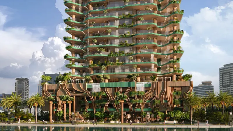 - The facade embodies “Wild Luxury,” blending opulent living with an organic connection to nature, designed to enrich the soul, health, and well-being.